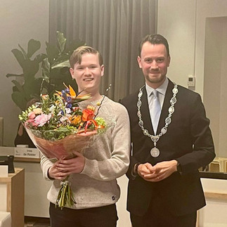 Bas Oostwouder en Pieter-Jan de Rijk gaan Natuurlijk Nieuwkoop in de raad vertegenwoordigen. Ze worden ondersteund door Matthijs Geijtenbeek, Fabio Maurits en Pien Schrama, zij zijn als fractie- assistent benoemd. Na het afleggen van de eed of belofte namen ze alle 5 de felicitaties en bloemen van burgemeester Robbert-Jan in ontvangst.